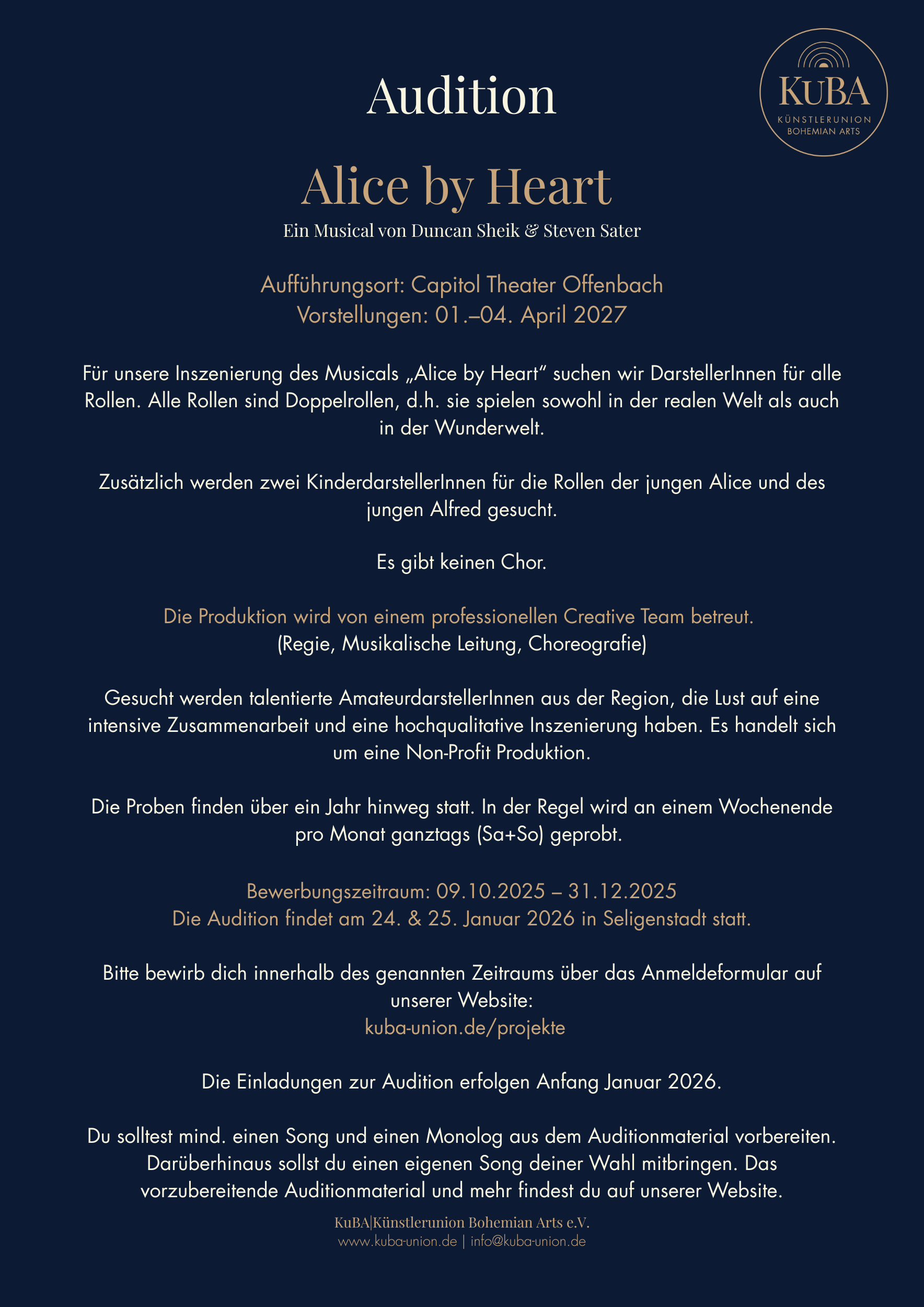 Anmeldebogen Gesuchte Rollenprofile Handlung "Alice by Heart" Songs/Gesangstexte und Playbacks Monologe/Vorsprechtexte Kindercasting